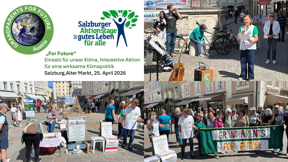 An effective climate policy is more urgent than ever – this is shown by all the results of climate research. After all, just because you talk less or no longer about a topic does not mean that the problem is off the table. With this action by the Salzburg “For Future” movements, Grandparents for Future, together with Fridays for Future, Religions for Future, and Scientists for Future, are once again drawing attention to the urgency of action in the sense of climate protection. Salzburg, April 25, 2026.